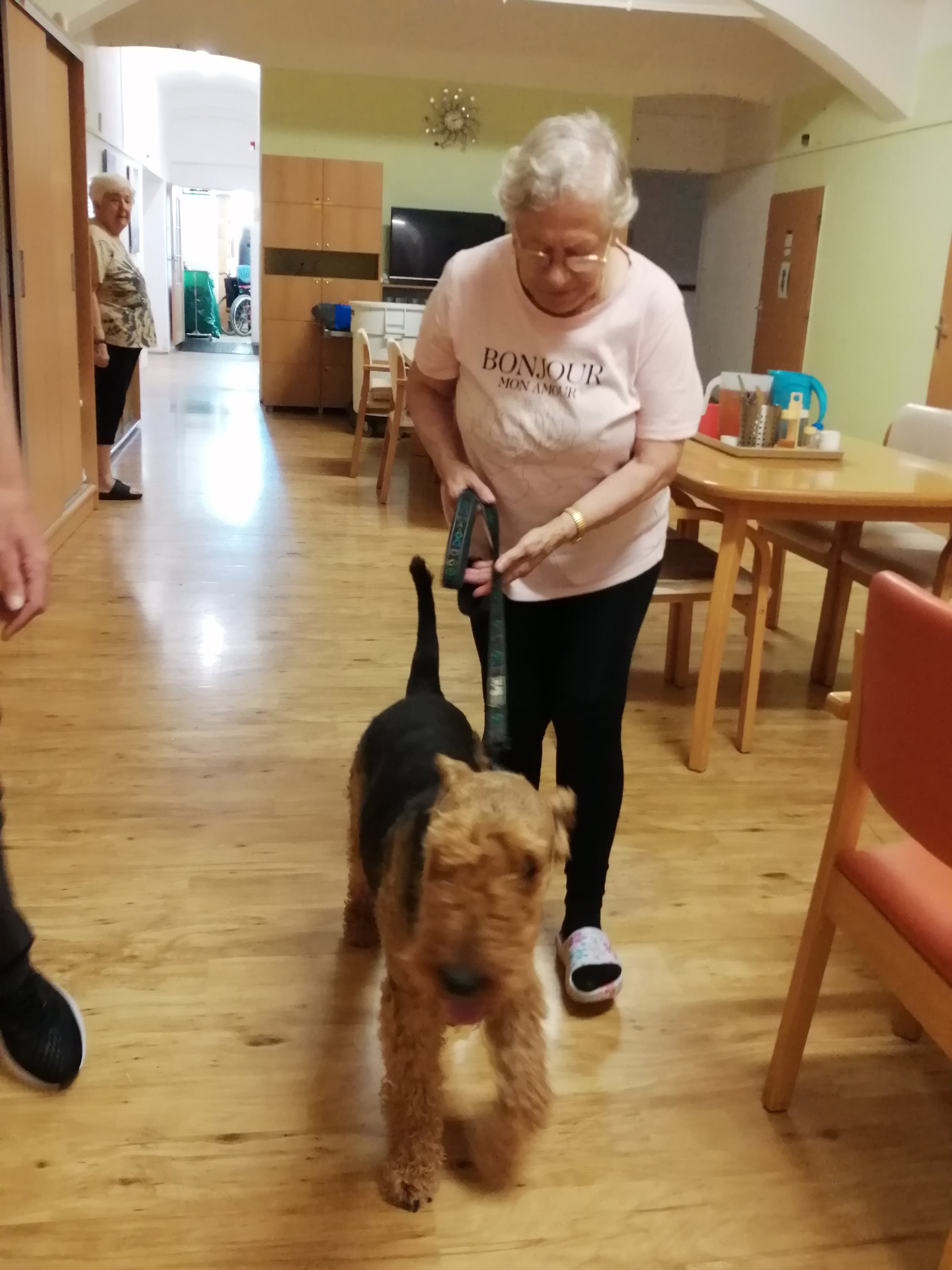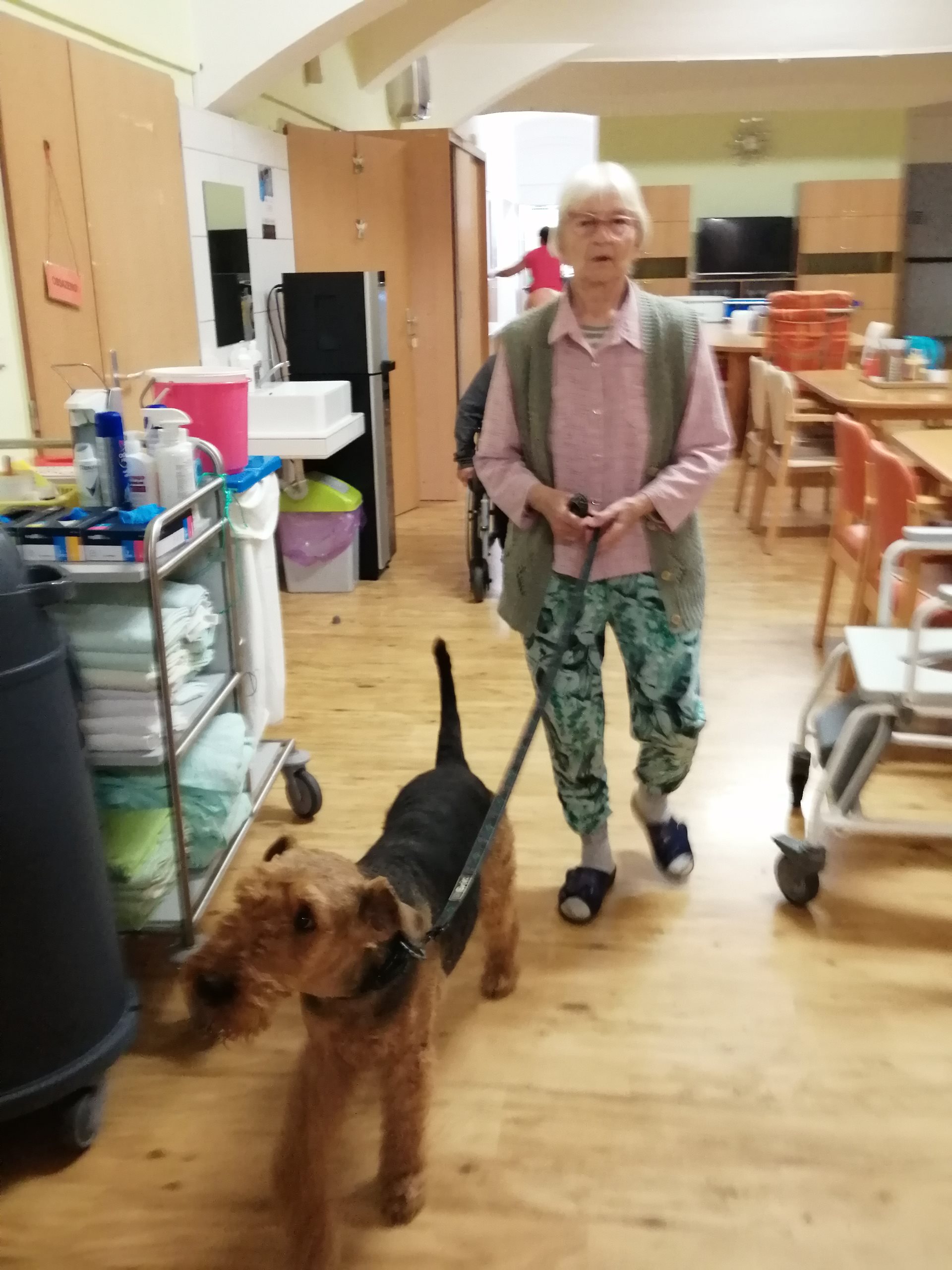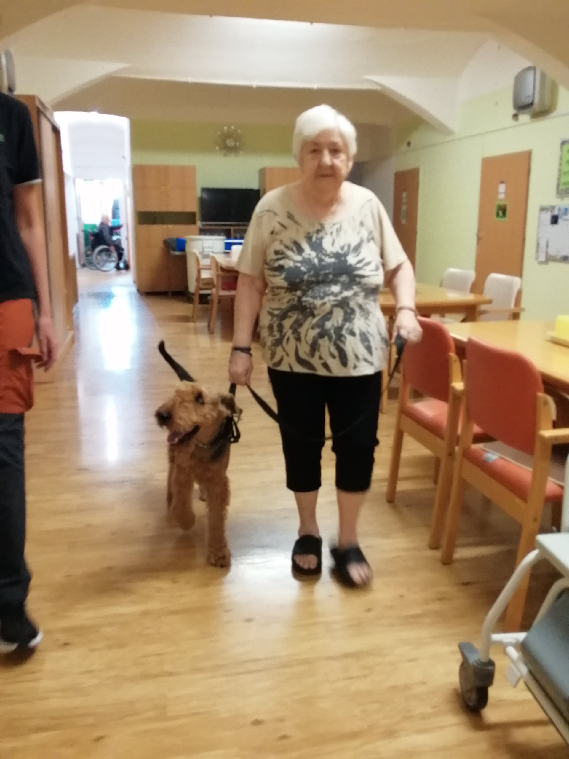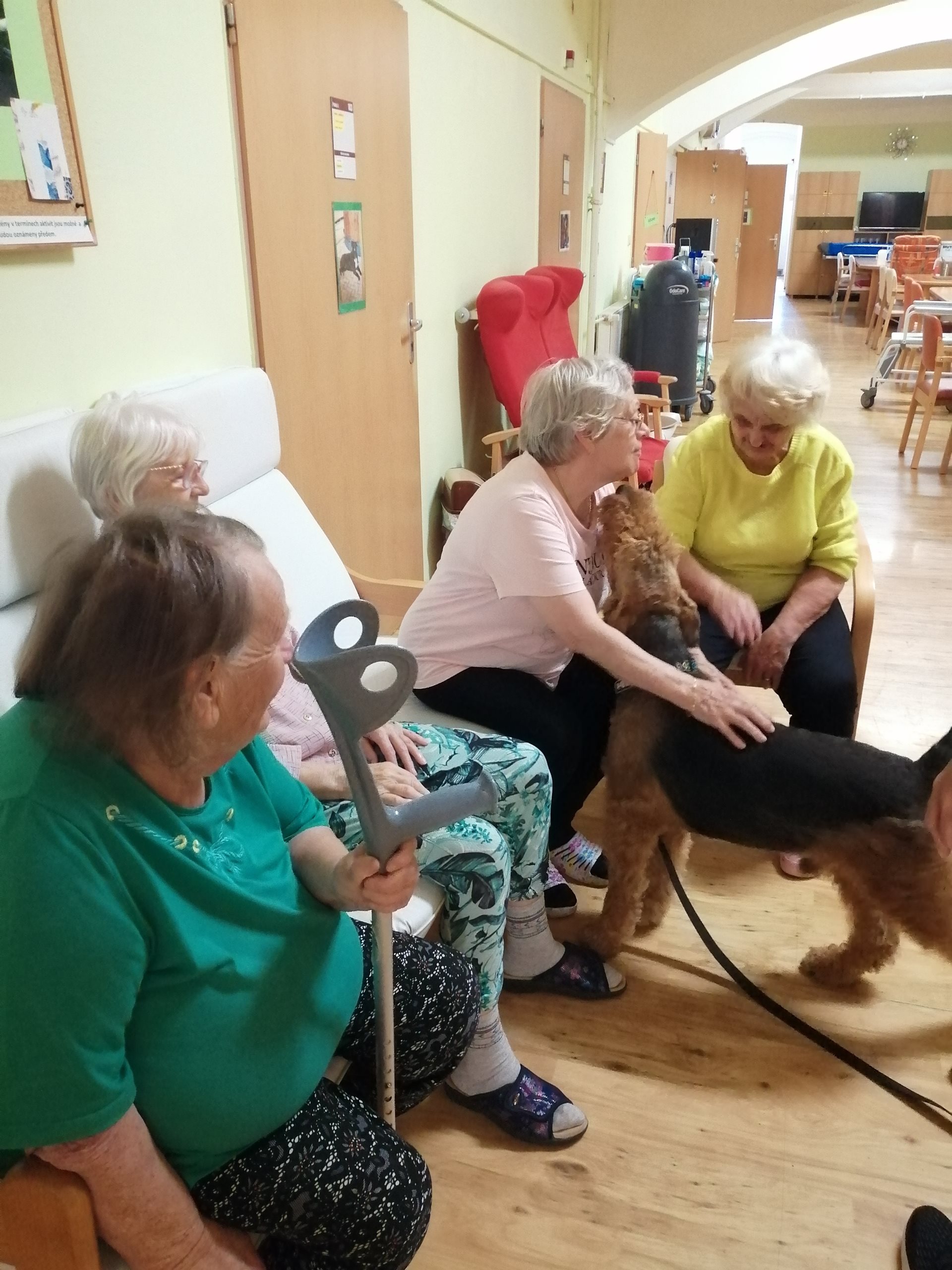 Pondělní dopoledne na oddělení zpestřila návštěva pejska, která potěšila všechny přítomné. Klienti i personál měli možnost projít se se čtyřnohým miláčkem po hale oddělení, což jim přineslo velkou radost. Pejsek nezapomněl ani na ty, kteří zůstali upoutáni na lůžko – přišel i za nimi a svou přítomností jim vykouzlil úsměv na tváři. Tato nečekaná společnost přispěla k zlepšení nálady všech.
