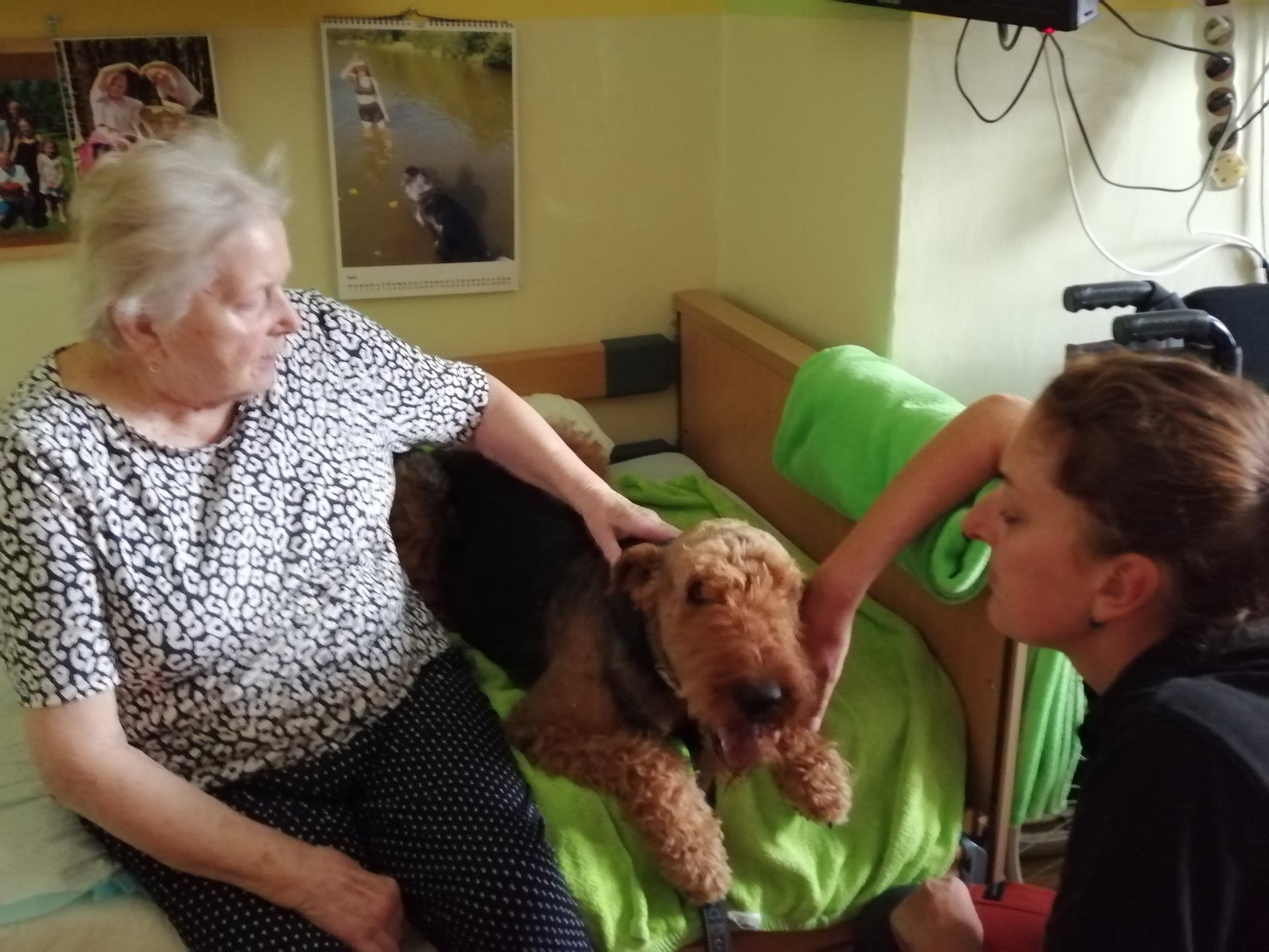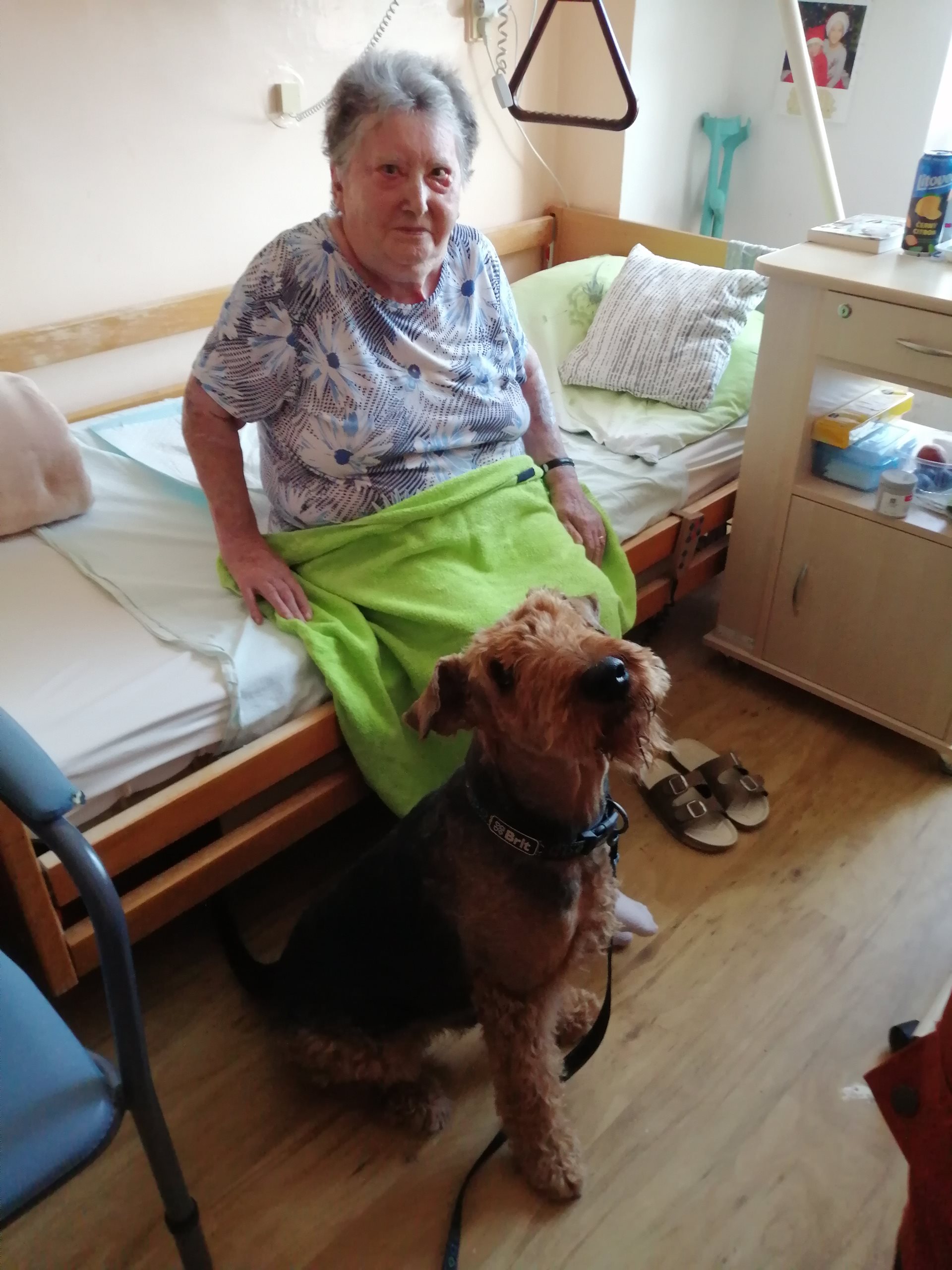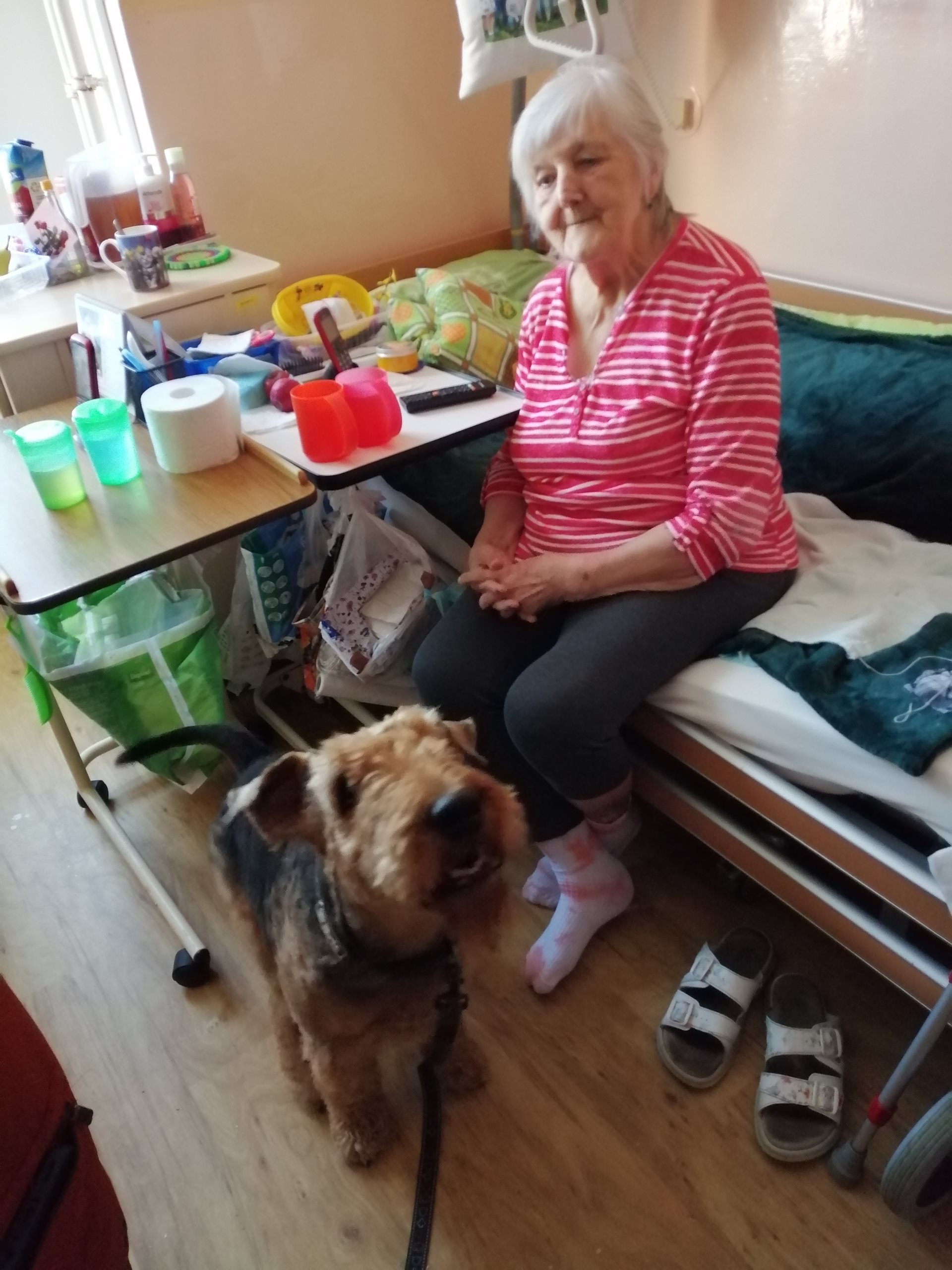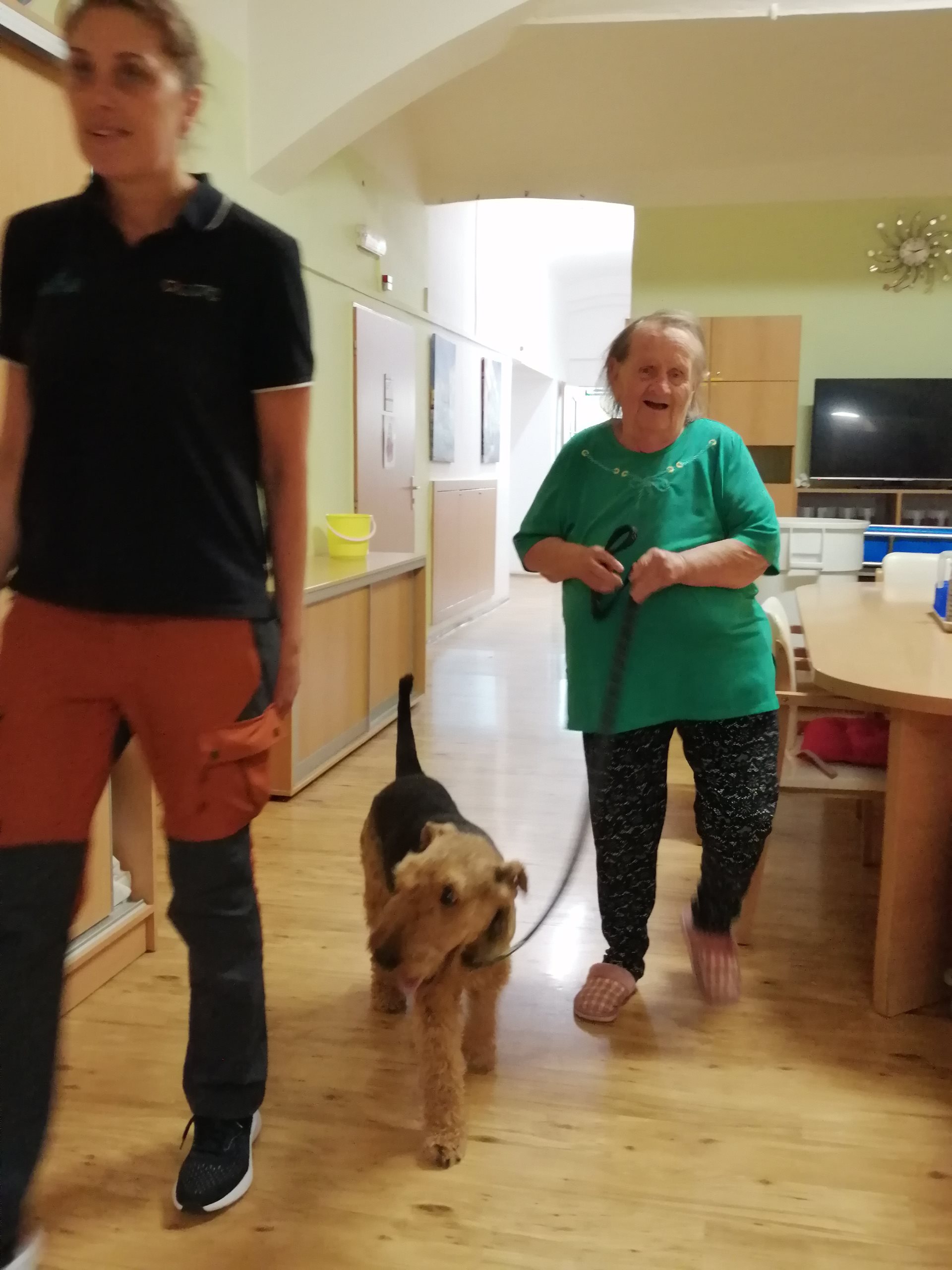 Pondělní dopoledne na oddělení zpestřila návštěva pejska, která potěšila všechny přítomné. Klienti i personál měli možnost projít se se čtyřnohým miláčkem po hale oddělení, což jim přineslo velkou radost. Pejsek nezapomněl ani na ty, kteří zůstali upoutáni na lůžko – přišel i za nimi a svou přítomností jim vykouzlil úsměv na tváři. Tato nečekaná společnost přispěla k zlepšení nálady všech.