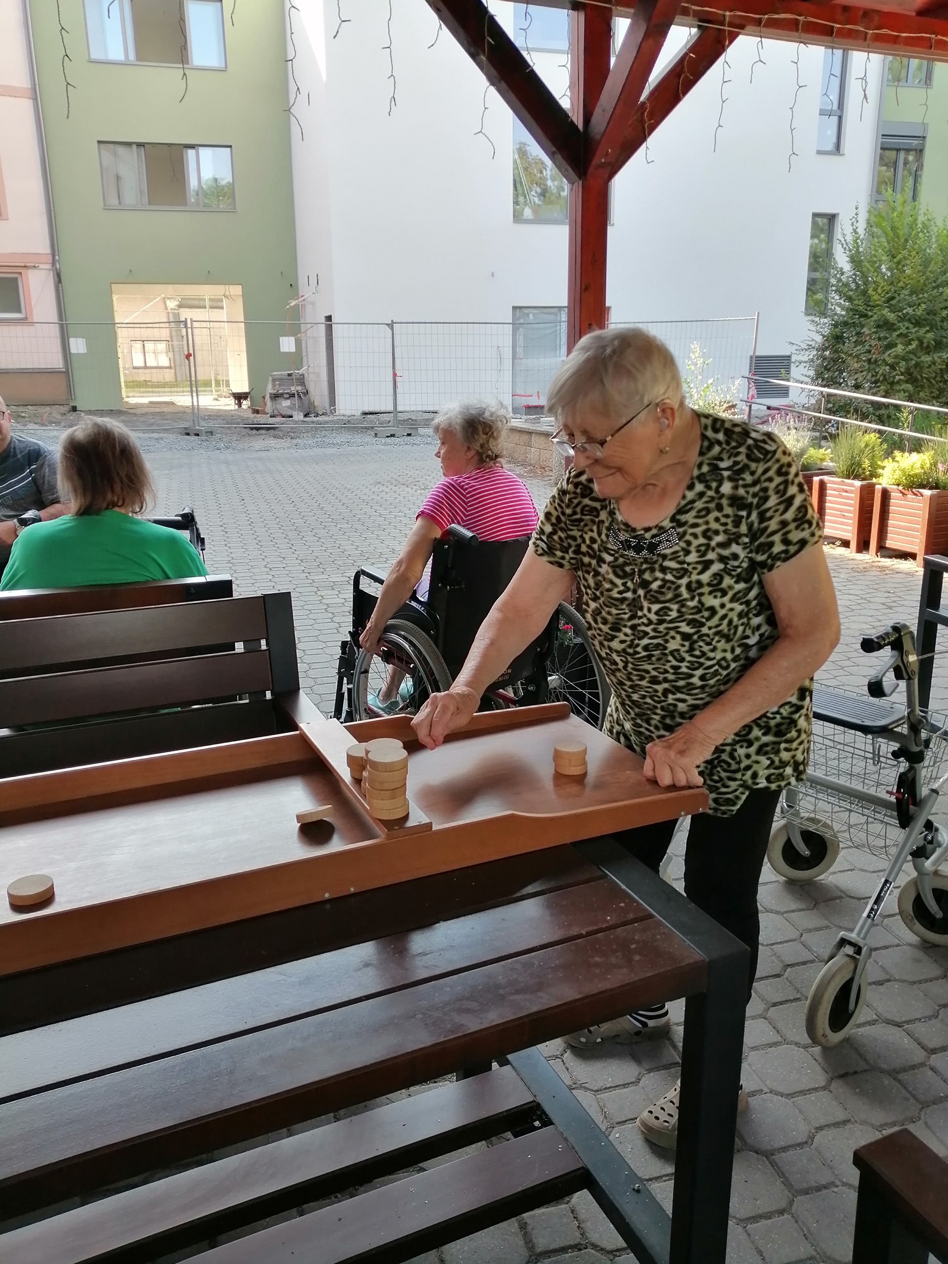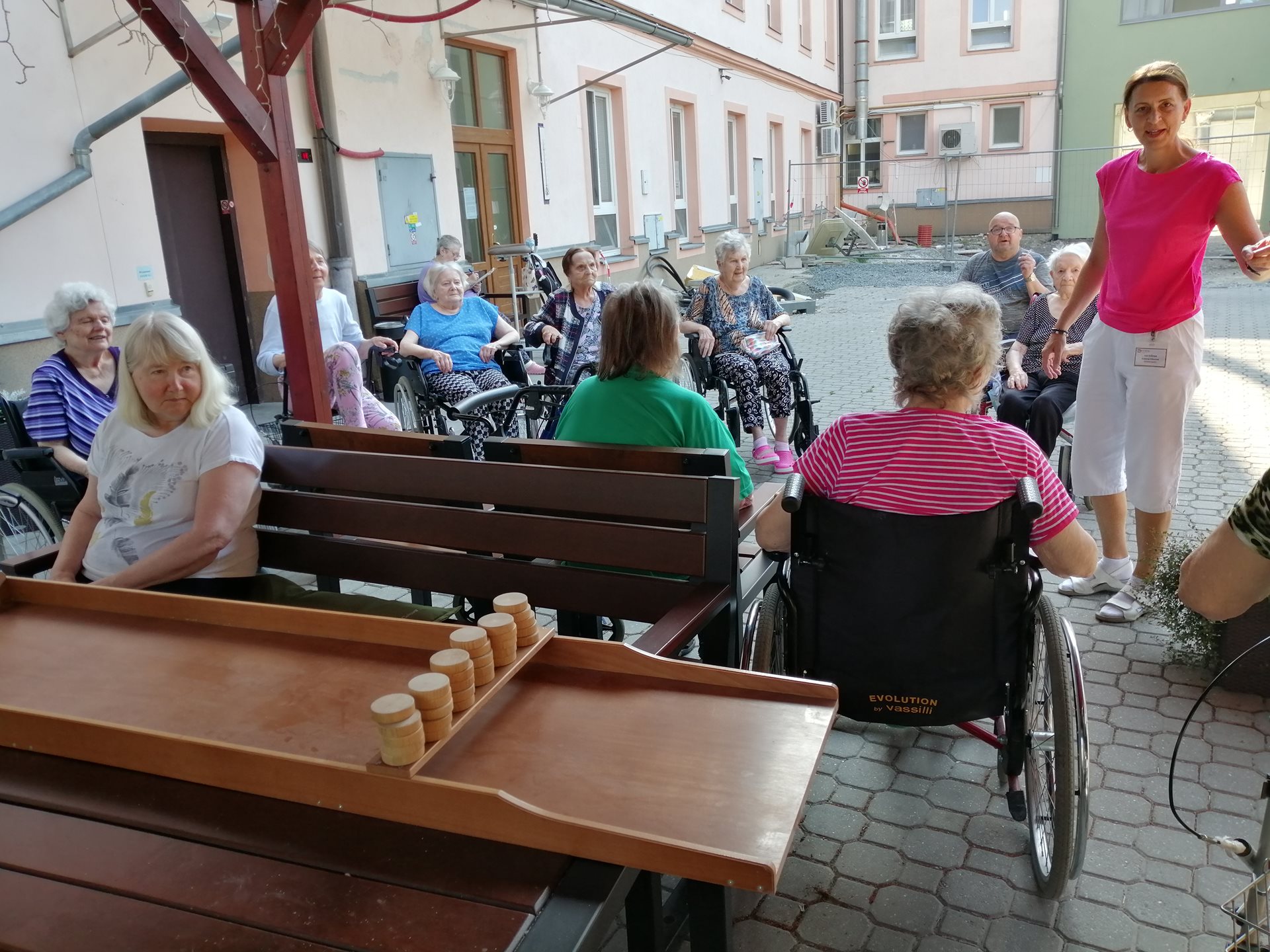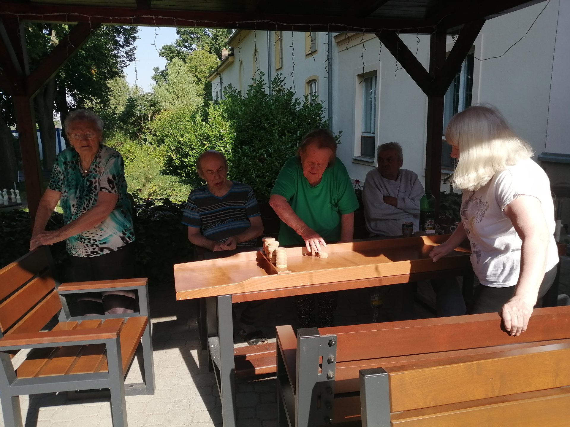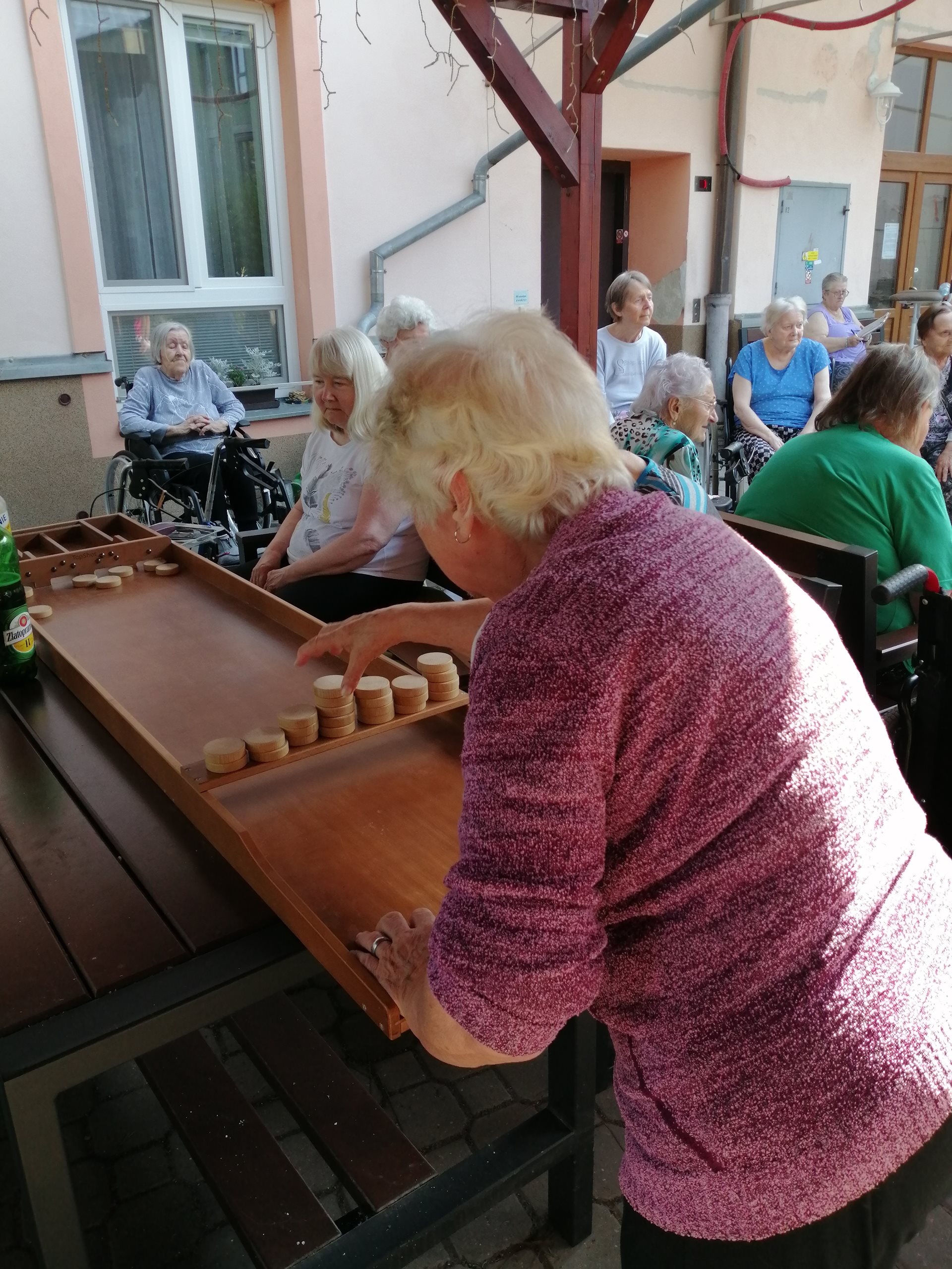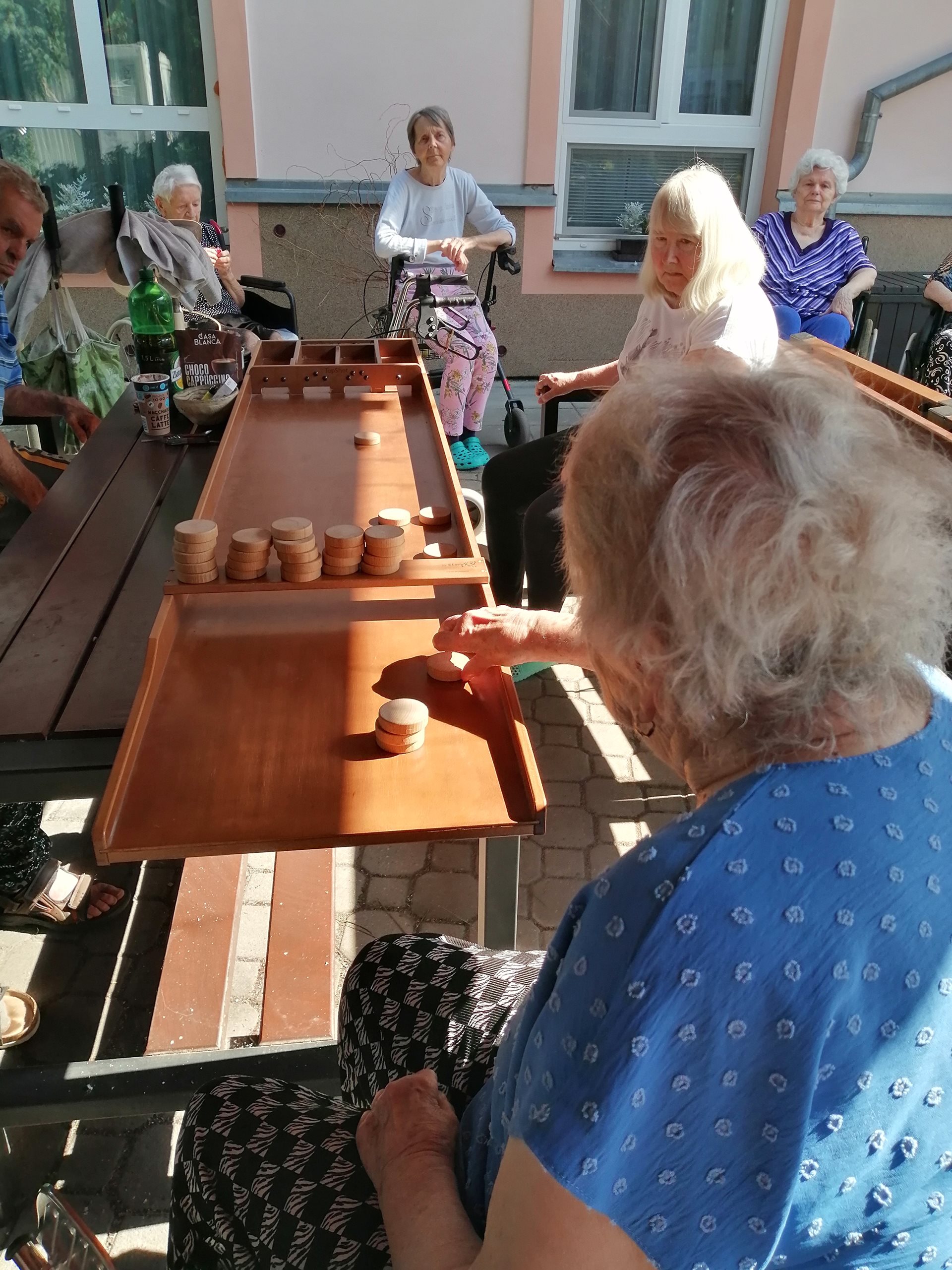 Dnešní dopoledne se naše zahrada rozzářila nejen slunečními paprsky, ale i radostnou atmosférou. Na programu byl holandský billiard – netradiční a velmi zábavná hra, která má své kořeny v Nizozemsku a dokonce se v ní pořádají mistrovství světa.