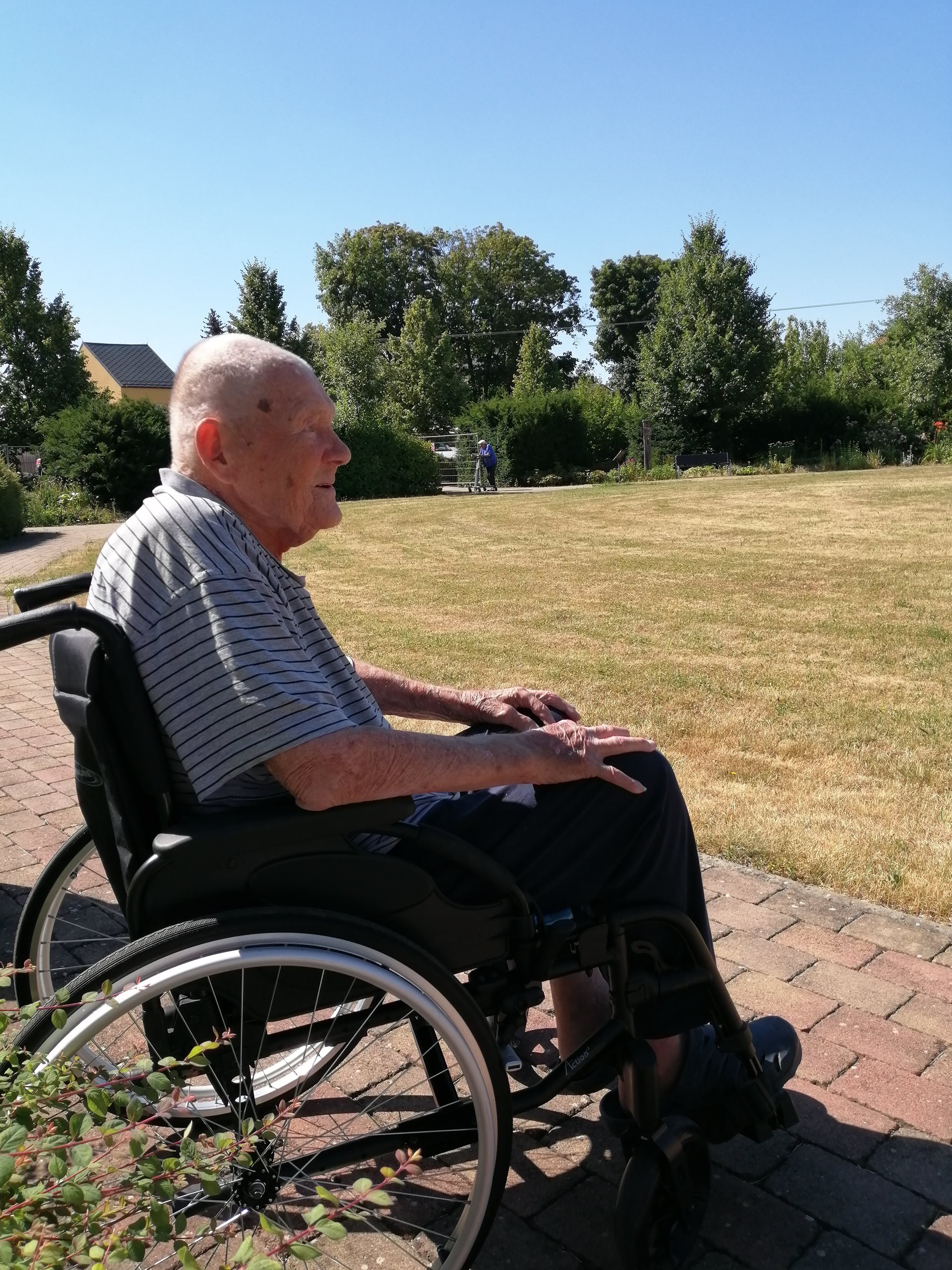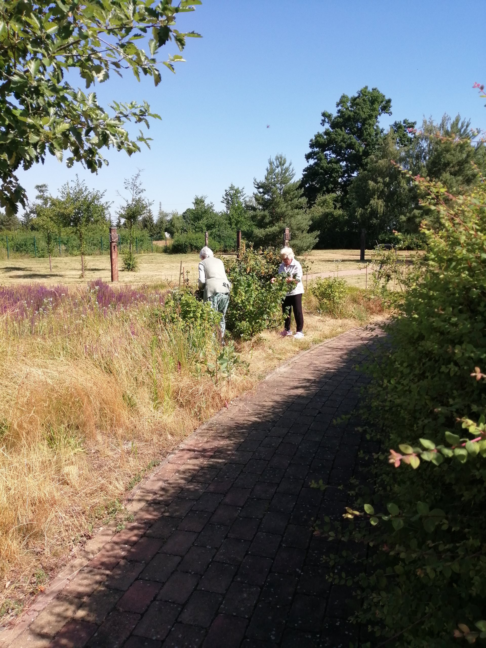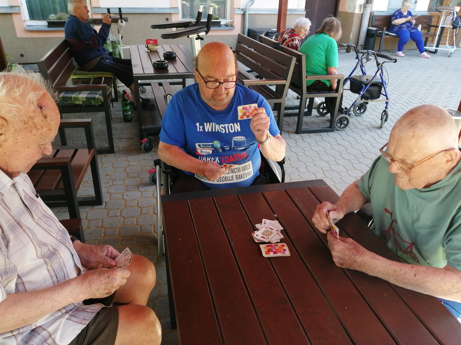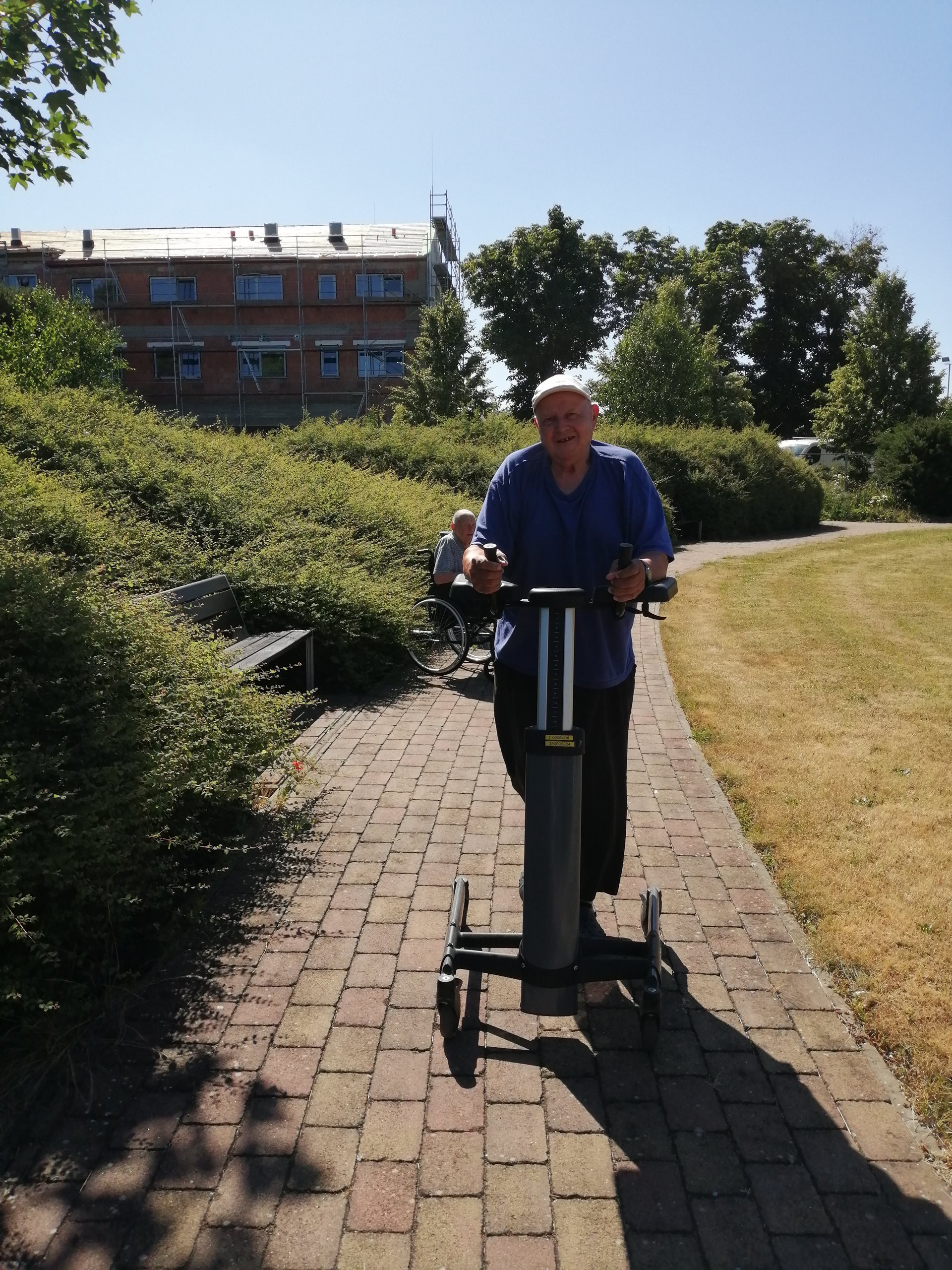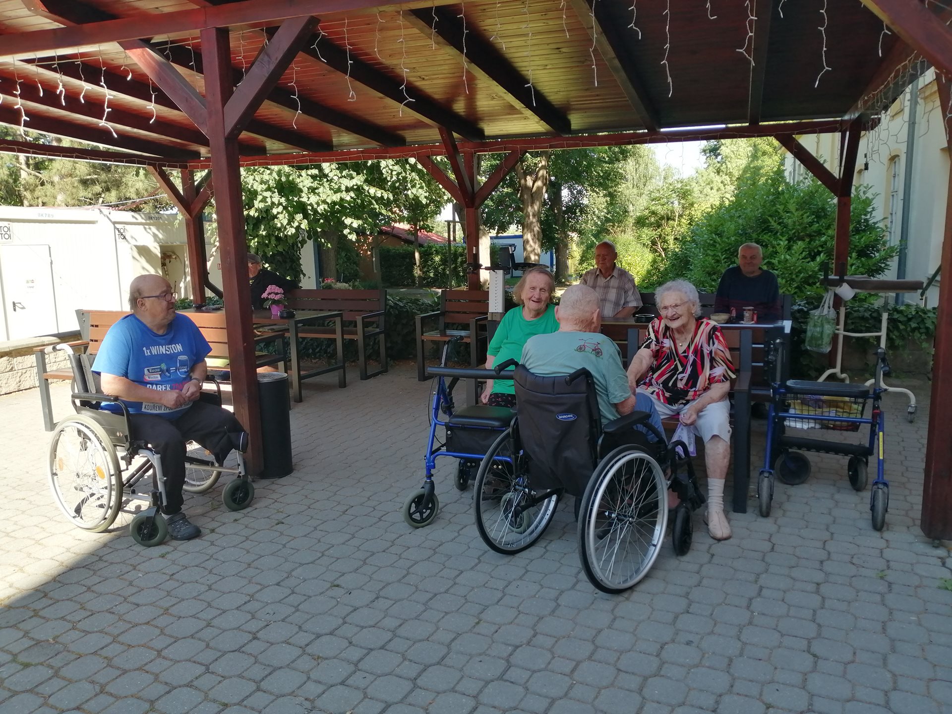 I přes probíhající stavební práce a s tím spojený dočasný nekomfort si klienti dle možností nadále užívají pobyt v zahradě – ať už při odpočinku na lavičkách, krátkých procházkách, nebo společných venkovních aktivitách.