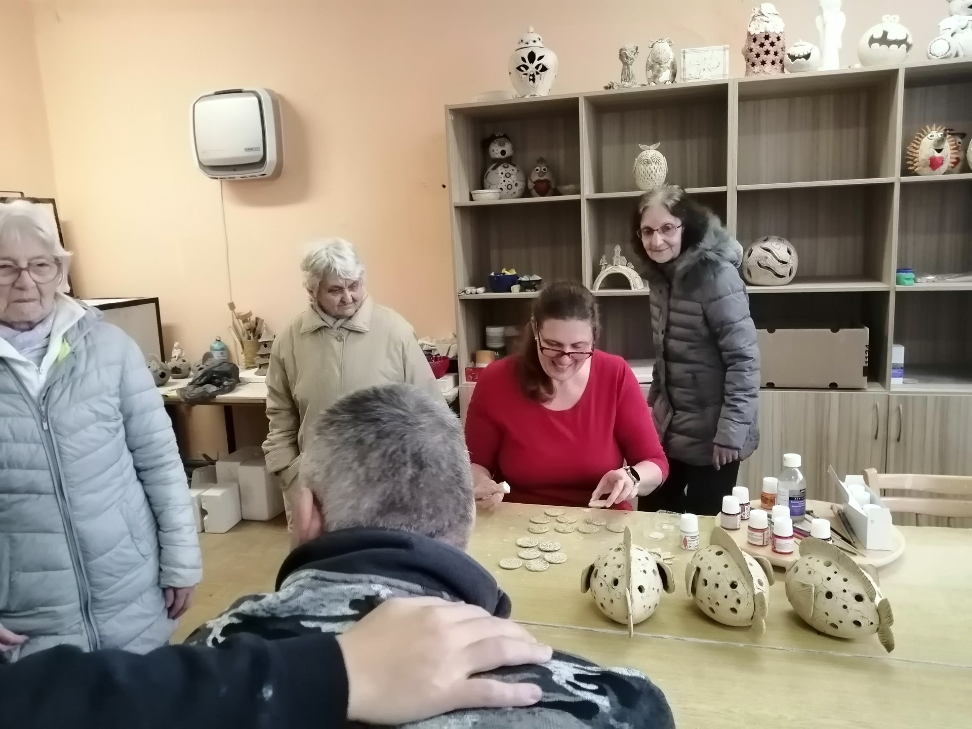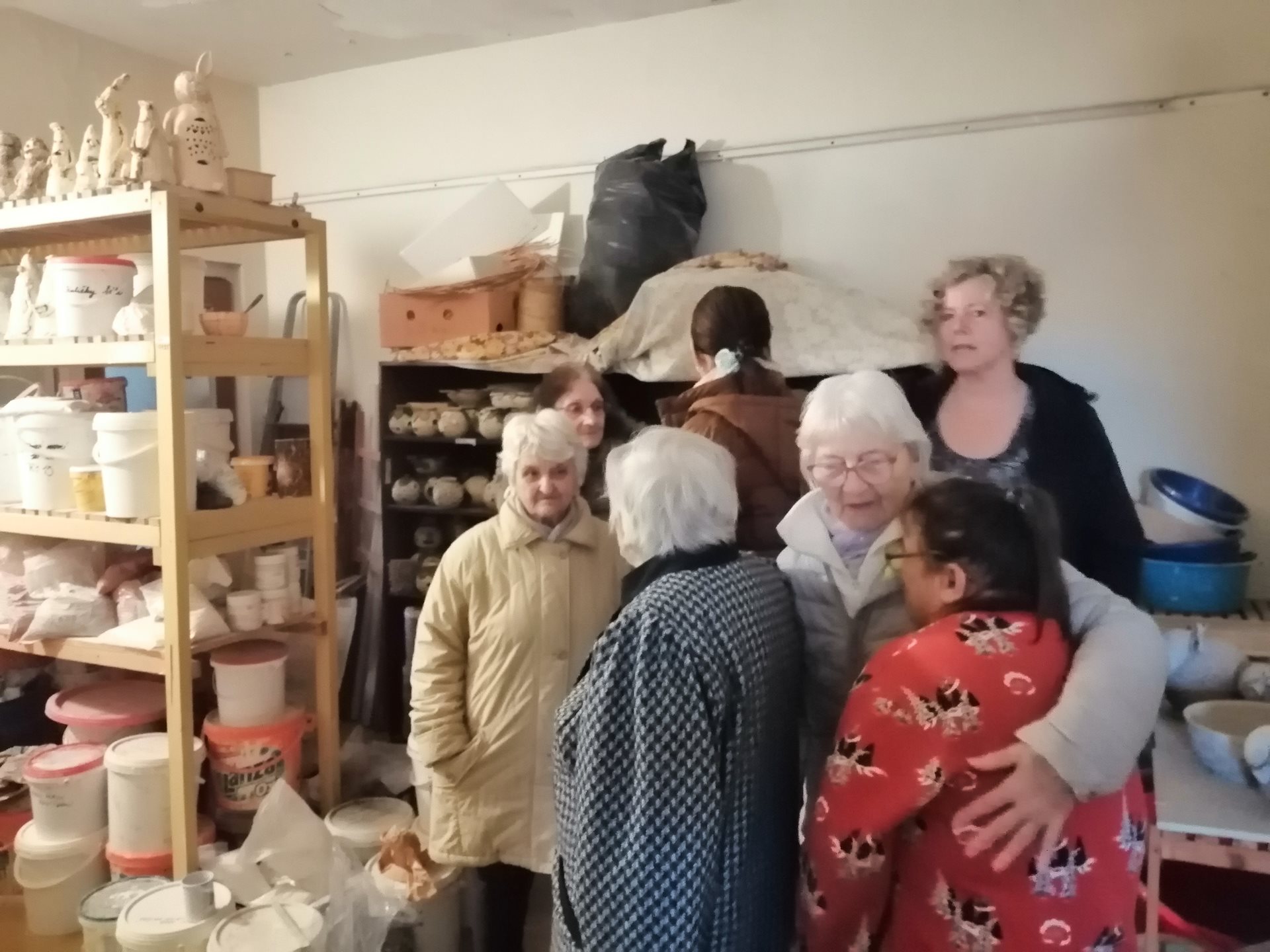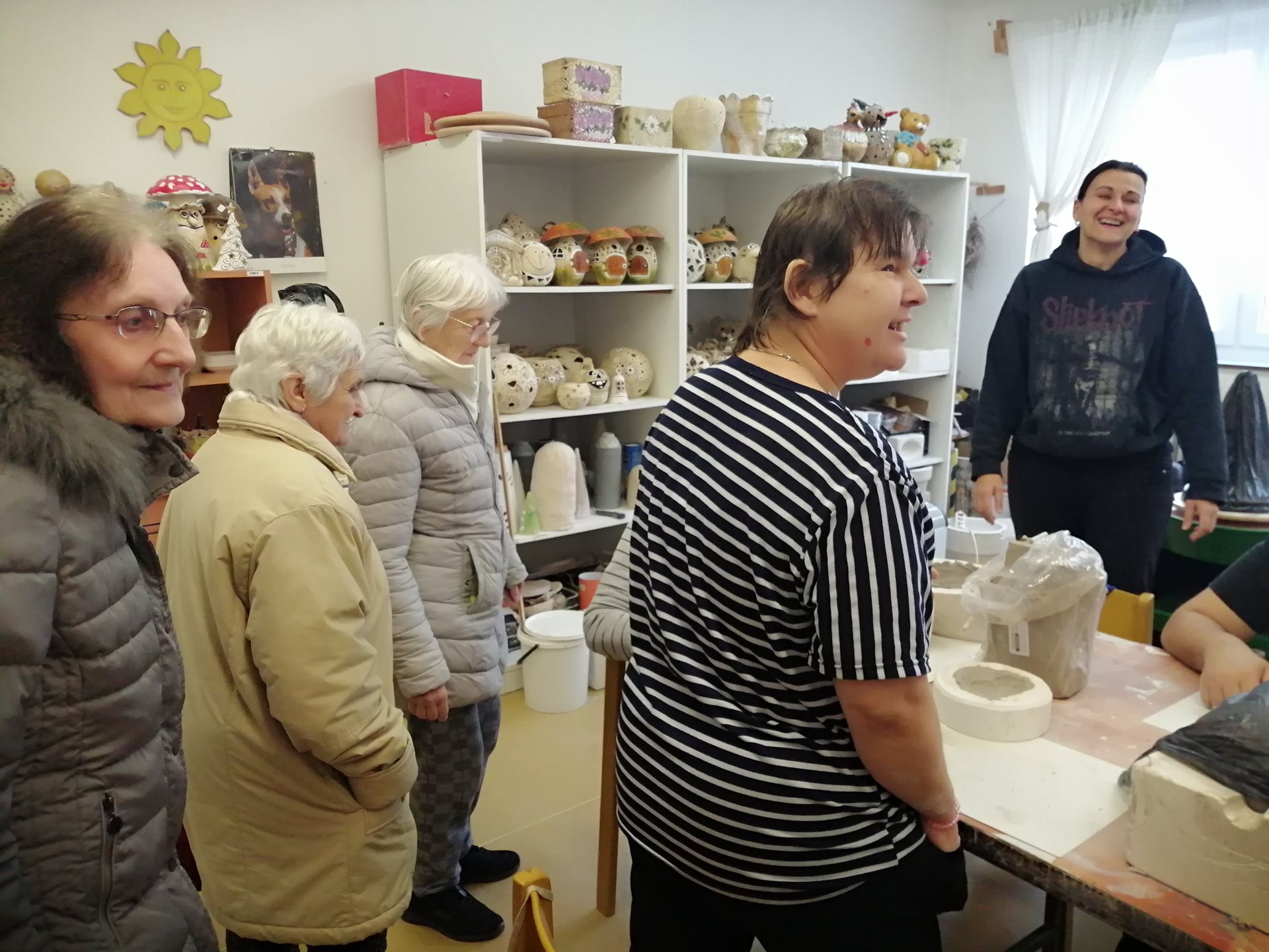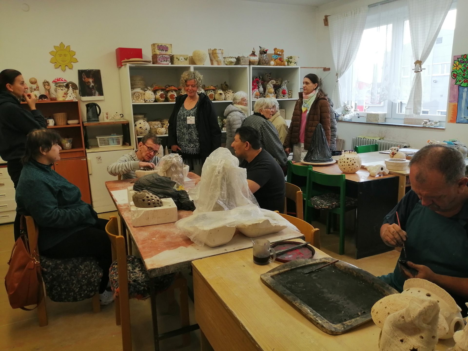 Navštívili jsme také chráněnou keramickou dílnu, kde jsme měli možnost sledovat klienty dílny přímo při práci. Se zaujetím jsme pozorovali, jak pod jejich rukama vznikají originální keramické výrobky. Tvůrčí prostředí a přátelská atmosféra dílny všechny nadchly — našim klientům se návštěva velmi líbila.