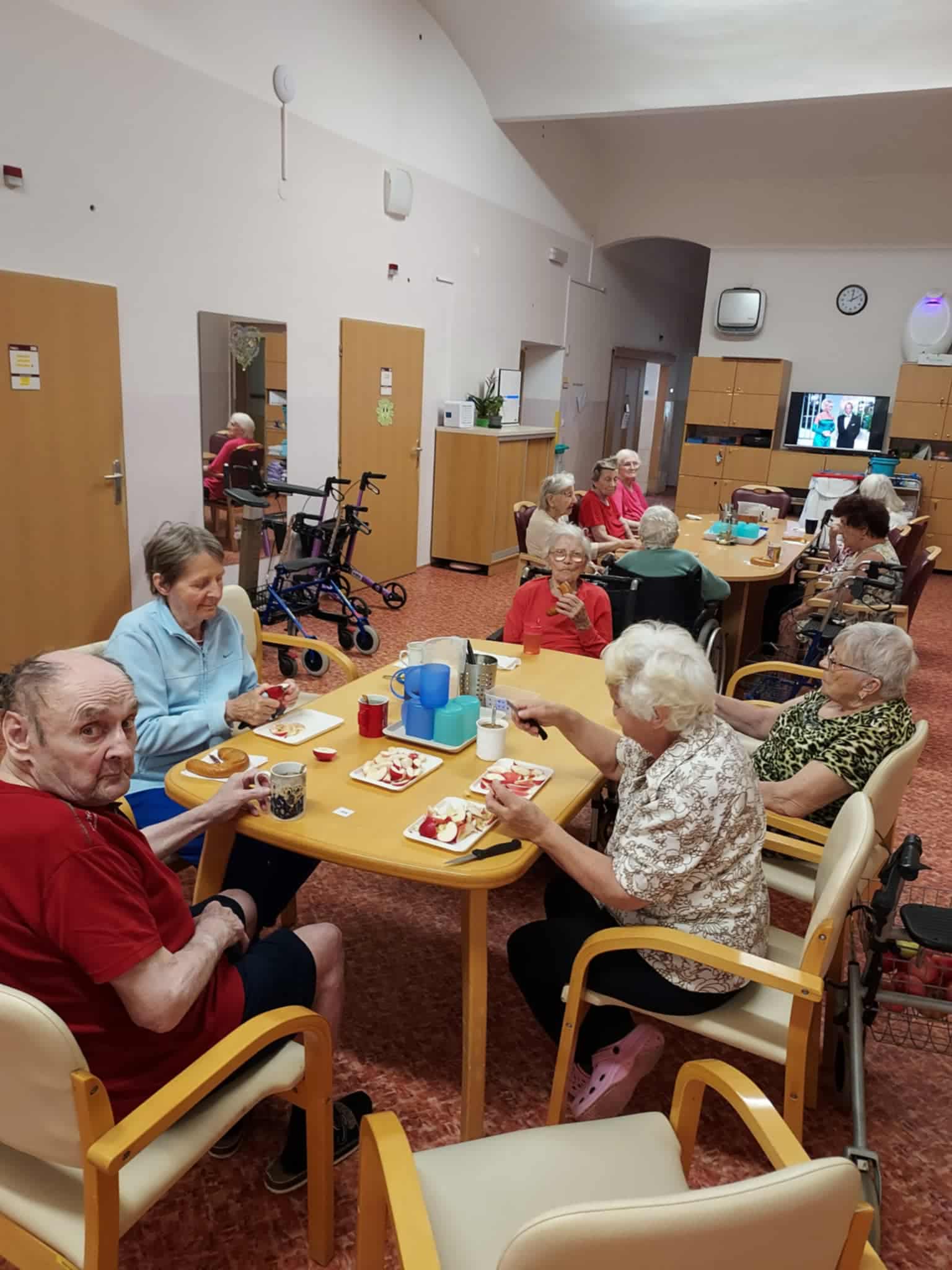 Společně jsme je nasbírali a následně v jídelně připravili – jablka byla oloupána, vykrojená a nakrájená, aby si je mohli všichni vychutnat.